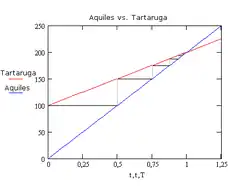 - Aquiles e a tartaruga: Aquiles corre contra uma tartaruga, sendo que a tartaruga começa dez metros adiantada, mas Aquiles corre ao dobro da velocidade da tartaruga. Quando Aquiles chega ao ponto onde a tartaruga começou, esta já avançou cinco metros. Quando Aquiles chega a esse ponto, a tartaruga voltou a adiantar-se 2,5 metros, e assim indefinidamente: Aquiles nunca consegue apanhar a tartaruga.