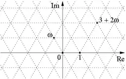 Assim como os inteiros de Gauss formam um ladrilhamento quadrado no plano complexo, os inteiros de Eisenstein formam um ladrilhamento triangular.