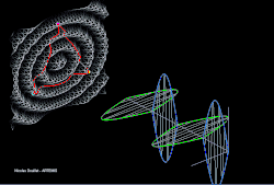 Visualização dos efeitos amplificados de uma onda gravitacional + polarizada (estilizada) em feixes de laser LISA/caminhos de braços