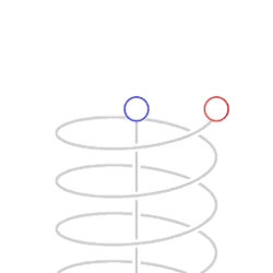 Representação esquemática da dilatação assimétrica do tempo velocidade. A animação representa o movimento mapeado em um diagrama de espaço-tempo de Minkowski, com duas dimensões de espaço (o plano horizontal) e posição no tempo verticalmente. Os círculos representam relógios, contando o lapso de tempo adequado. O sistema de coordenadas de Minkowski está se movendo em conjunto com o relógio não acelerado.