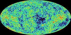 Uma imagem, criada usando dados do telescópio de satélite WMAP, da radiação emitida não mais do que algumas centenas de milhares de anos após o Big Bang.