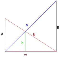 No problema das escadas cruzadas, duas escadas em posições opostas através de um beco, cada um com os pés na base de uma parede lateral, com um encostado a uma parede na altura A e o outro encostado na parede oposta à altura B, como mostrado. As escadas cruzadas a uma altura de h acima do chão do beco. Então, h é a metade a média harmônica de A e B. Este resultado ainda mantém se as paredes estão inclinadas, mas ainda paralelas e as "alturas" A, B e h são medidos como distâncias do chão ao longo de linhas paralelas às paredes.