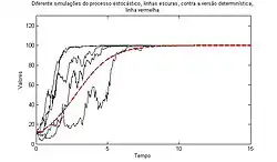 Abaixo segue o código em Matlab para resolvê-la, e logo abaixo segue algumas simulações ao lado da solução determinística.