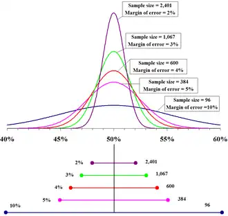 A margem de erro pode ser definida para qualquer nível de confiança, mas geralmente são escolhidos 90%, 95% (principalmente) ou 99%.[3] A magnitude da margem de erro também pode ser determinada pela configuração da amostra e particularmente pelo tamanho da amostra para uma pesquisa (uma amostra maior resulta em uma margem de erro menor, com todo o resto permanecendo igual).[1]