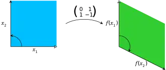 Por exemplo, a matriz 2 × 2 pode ser vista como a transformação do quadrado unitário num paralelogramo com vértices em (0, 0), (a, b), (a + c, b + d) e (c, d). O paralelogramo retratado à direita é obtido multiplicando A sucessivamente por cada um dos vetores coluna , , e . Estes vetores definem os vértices do quadrado unitário.[67] A tabela seguinte mostra várias matrizes reais 2 × 2 com as aplicações lineares associadas de . O original a azul é mapeado para a grade e formas a verde. A origem (0, 0) está marcada com um ponto preto.