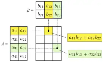 A multiplicação de duas matrizes corresponde à composição das transformações lineares representadas por cada matriz. Ela é definida se e somente se o número de colunas da matriz da esquerda for igual ao número de linhas da matriz da direita. Se é uma matriz m × n e é uma matriz n × p, então o seu produto matricial é a matriz m × p cujas entradas são dadas pelo produto escalar da linha correspondente de e da coluna correspondente de :[46] onde e .[47] Por exemplo, a entrada sublinhada 2340 no produto é calculada como :