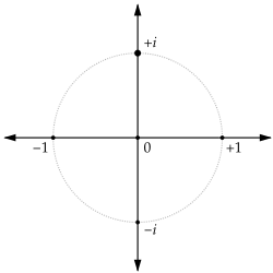Embora não haja raízes quadradas reais de −1, o número complexo i satisfaz i2 = −1 e, como tal, pode ser considerado como uma raiz quadrada de −1.[1][2] O único outro número complexo cujo quadrado é −1 é −i porque existem exatamente duas raízes quadradas de qualquer número complexo diferente de zero, o que segue do teorema fundamental da álgebra. Na álgebra dos quatérnios – onde não se aplica o teorema fundamental – que contém os números complexos, a equação x2 = −1 tem infinitas soluções [en].