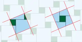 Similarmente, a sobreposição de dois mosaicos pitagóricos pode ser usada para gerar uma fragmentação em seis peças de dois quadrados desiguais em um par diferente de quadrados desiguais.[4]