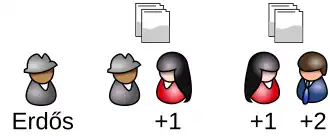 - Alguém que nunca escreveu um artigo com Erdős, mas escreveu um artigo com alguém que tem número de Erdős igual a 1, tem número de Erdős igual a 2 (é um coautor de um coautor do Erdős);