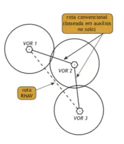 Na figura ao lado, os círculos representam as áreas de cobertura de cada VOR. A linha contínua representa a rota com base em auxílios no solo; seguindo ao longo desta rota, uma aeronave que pretenda sair do VOR1 para o VOR3, é obrigada a voar em direção ao VOR2 e, só então, seguir para o VOR3. A linha tracejada representa uma rota RNAV, que permite que uma aeronave voe em linha reta do VOR1 diretamente para o VOR3 ou vice-versa.