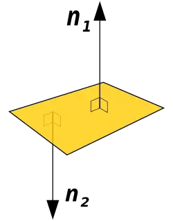 A normal é a reta perpendicular à superfície de um meio ótico em um determinado ponto.[2] Na reflexão da luz, o ângulo de incidência e o ângulo de reflexão são, respectivamente, o ângulo entre a normal e o raio incidente (no plano de incidência) e o ângulo entre a normal e o raio refletido.