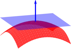 No caso tridimensional, a normal a uma superfície em um ponto P é um vetor perpendicular ao plano tangente à superfície no ponto P. A palavra "normal" também é usada como um adjetivo: uma linha normal a um plano, a componente normal de uma força, o vetor normal, etc. O conceito de normalidade é generalizado por ortogonalidade.