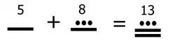 Adicionar e subtrair números abaixo de 20 usando numerais maias é muito simples. A adição é realizada combinando os símbolos numéricos em cada nível: