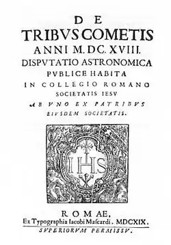 No início de 1619, sob o título "De Tribus Cometis Anni MDCXVIII", Grassi publicou uma palestra que deu ao Collegio Romano sobre três cometas que apareceram no outono de 1618. Ele argumentou que a ausência de paralaxe significava que os cometas deveriam estar muito distante da Terra, e ele sugeriu que existiam além da lua.[3]