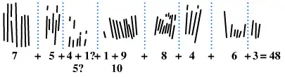 Além disso, o número de traços de ambos os lados da coluna central poderia indicar uma maior capacidade de contagem. Tanto os números da coluna esquerda como os da direita são todos números ímpares (9, 11, 13, 17, 19 e 21). Os números da coluna esquerda são todos os números primos compreendidos entre 10 e 20 (que formam um primo quádruplo), enquanto os da coluna direita consistem em 10 + 1, 10 - 1, 20 + 1 e 20 - 1. Os números de cada uma destas colunas somam 60, e o somatório dos números da coluna central é 48. Ambos os resultados são múltiplos de 12, o que reforça a tese da compreensão da multiplicação.[10]