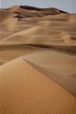 As ondas são perturbações que transportam energia à medida que se movem. As ondas mecânicas se propagam através de um meio – ar ou água, fazendo-o oscilar ao passar.[64] Ondas de vento são ondas de superfície do mar que criam o padrão caótico característico de qualquer grande massa de água, embora seu comportamento estatístico possa ser previsto com modelos computacionais.[65] À medida que as ondas na água ou no vento passam sobre a areia, elas criam padrões de ondulações. Quando os ventos sopram sobre grandes massas de areia, eles criam dunas, às vezes em extensos campos de dunas como no deserto do Taclamacã. As dunas podem formar uma variedade de padrões, incluindo crescentes, linhas retas muito longas, estrelas, cúpulas, parábolas e formas longitudinais.[66]