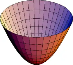 onde e são constantes que determinam o grau de curvatura nos planos - e - respectivamente. Este é um parabolóide elíptico, que abre para cima.
