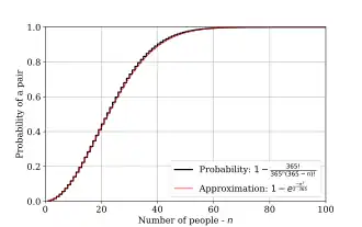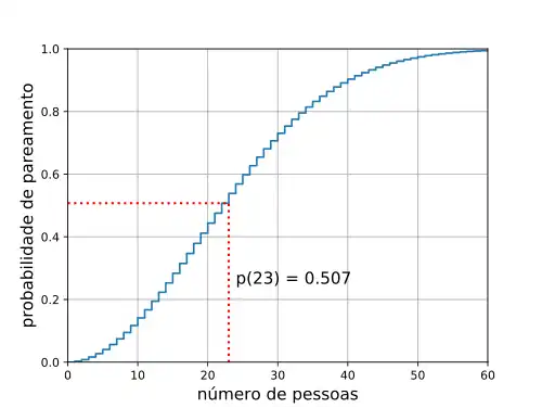 Esta probabilidade ultrapassa 1/2 para n = 23 (com valor aproximado de 50.7%). A seguinte tabela mostra a probabilidade para alguns valores de n (ignorando anos bissextos como descrito anteriormente):