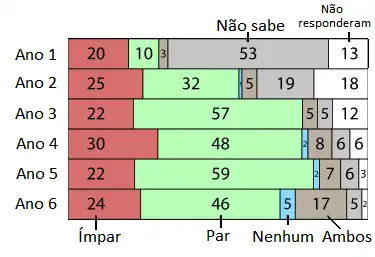 A tabela à direita[33] retrata as crenças das crianças sobre a paridade do zero à medida que progridem do Ano 1 ao Ano 6 do sistema educacional inglês. Os dados são de Len Frobisher, que realizou um par de levantamentos de crianças em escolas na Inglaterra. Frobisher estava interessado em saber como o conhecimento da paridade de um único dígito se traduz no conhecimento da paridade de múltiplos dígitos, e o zero aparece proeminente nos resultados.[35]