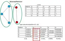 Em tal cenário, o segundo menor autovalor (λ) de L, produz um limite inferior para o custo ótimo (c) de partição de corte com relação c ≥ λ/n. O autovetor (V) correspondente à λ, chamado de vetor de Fiedler, bissecciona o grafo em apenas duas comunidades baseadas no sinal da entrada do vetor correspondente. Dividindo em um número maior de comunidades é geralmente atingido ao fazendo bisseções repetidas, mas nem sempre isso dá resultados satisfatórios. Os exemplos nas figuras 1 e 2 mostram o espectro de bisseção.