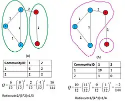 Particionamento mínimo corte no entanto falha quando o número de comunidades a ser particionado, ou o tamanho das partições são desconhecidas. Por exemplo, otimizando o tamanho do corte para grupos de tamanho qualquer coloca todos os vértices na mesma comunidade. Além disso, o tamanho do corte pode ser a coisa errada a minimizar uma vez que uma boa divisão não é apenas aquele com pequeno número de arestas entre as comunidades. Isso motivou o uso da Modularidade (Q) [9] como uma métrica para otimizar e balancear uma partição de grafo. O exemplo na figura 3 ilustra 2 instâncias do mesmo grafo de modo que em (a) modularidade (Q) representa a métrica de particionamento e em (b), proporção de corte representa a métrica de particionamento. Entretanto, sabe-se que Q sofre um limite de resolução, produzindo resultados duvidosos quando está lidando com comunidades pequenas. Neste contexto, Surprise[10] foi proposta como uma alternativa de aproximação para a avaliação de qualidade de uma partição.