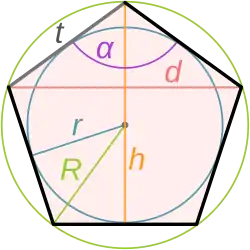 Semelhante a todo polígono convexo regular, o pentágono convexo regular tem um círculo inscrito. A apótema, que é o raio r do círculo inscrito, de um pentágono regular está relacionado ao comprimento do lado t por