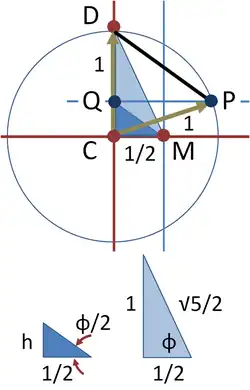 Se DP for realmente o lado de um pentágono regular, , então DP = 2 cos(54°), QD = DP cos(54°) = 2cos2(54°), e CQ = 1 − 2cos2(54°), que é igual a −cos(108°) pelo cosseno fórmula do ângulo duplo. Este é o cosseno de 72°, que é igual a como desejado.