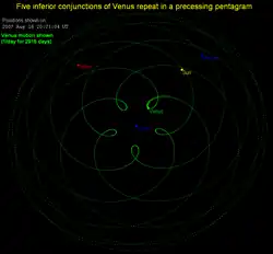O planeta Vénus descreve um pentagrama perfeito através do plano eclíptico do céu a cada oito anos. [carece de fontes] Conjunções inferiores sucessivas dele se repetem numa ressonância orbital muito próxima a 13:8 (a Terra orbita 8 vezes para cada 13 órbitas de Vênus), criando uma sequência de precessão pentagrâmica. [carece de fontes]