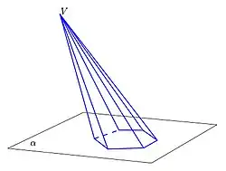 Uma pirâmide é a reunião dos segmentos de reta com uma extremidade em um ponto fixo (vértice) e outra sobre um polígono (base) pertencente a um plano que não contém .[1][2] Equivalentemente, é um poliedro com uma face poligonal (base) e demais faces triangulares (faces laterais), as quais tem exatamente um ponto em comum (vértice).[3]
