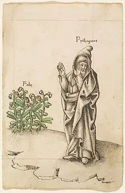 Manuscrito francês de 1512/1514, mostrando Pitágoras virando o rosto para longe das favas em repulsa.