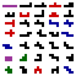 Os 35 hexaminós livres, coloridos de acordo com sua simetria