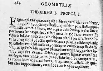 O princípio de Cavalieri (a base do método dos indivisíveis) refere-se às seguintes duas proposições em geometria:[2][3][4]