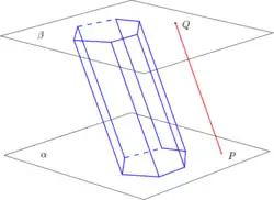 O termo prisma também pode significar prisma ilimitado, que é o sólido formado pela união de todas as retas paralelas a uma reta dada e que interceptam um polígono fixo não paralelo a .[1] Salvo menção, usaremos o termo prisma para significar um prisma limitado.