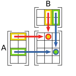 A figura à esquerda mostra como calcular o elemento (1,2) e o elemento (3,3) de AB se A é uma matriz 4×2, e B é uma matriz 2×3. Elementos de cada matriz são postos par a par na direcção das setas; cada par é multiplicado e os produtos são somados. A posição do número resultante em AB corresponde à linha e coluna que foi considerada.
