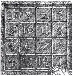 O chamado “Quadrado de Dürer” é um Quadrado Mágico representado no canto superior direito da gravura Melancolia, obra do pintor e ilustrador alemão Albrecht Dürer, que também teve interesse em matemática, geometria, geografia e arquitetura. Aqui se apresenta a disposição dos números no quadrado: