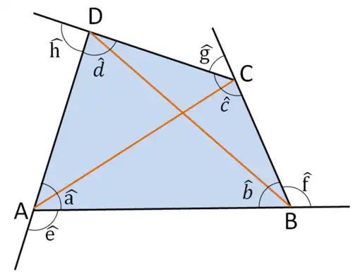 Assim, seja um quadrilátero qualquer, cujos ângulos internos medem , , e e seus ângulos externos, respectivamente , , e , temos: