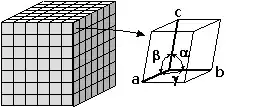Esquema de uma célula unitária, mostrando as arestas e ângulos caracterizadores