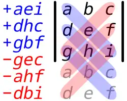 o seu determinante pode ser calculado pelo seguinte esquema: Inicialmente, copie as duas primeiras colunas da matriz à direita da 3ª coluna, de modo que seja obtida uma sequência de 5 colunas. Em seguida, some os produtos das três diagonais que partem de cima para baixo (linhas contínuas) e subtraia os produtos das três diagonais que vão de baixo para cima (linhas tracejada). Isso produz[1][2][3]