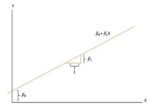 O chamado intercepto ou coeficiente linear () é utilizado para representar o ponto em que a reta da regressão corta o eixo Y quando X = 0. Já o parâmetro representa a inclinação da reta ( ) é denominado como coeficiente de regressão ou coeficiente angular. A interpretação geométrica dos coeficientes podem ser vistos na imagem abaixo.