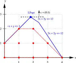Sem as restrições, a solução seria (0,0), onde tem o valor mais baixo. Mas esta solução não satisfaz as restrições. A solução do problema de otimização restrita mencionado acima é , que é o ponto com o menor valor de que satisfaz as duas restrições.