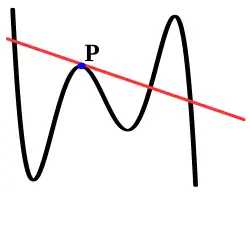 Uma reta tangente a uma curva em um ponto P pode ser uma reta secante a essa curva se ela intercepta a curva em pelo menos um ponto diferente de P. Outra maneira de ver isso é perceber que ser uma reta tangente a um ponto P é uma propriedade local, dependendo apenas da curva na vizinhança imediata de P, enquanto ser uma reta secante é uma propriedade global, já que todo o domínio da função que produz a curva precisa ser examinado.