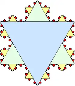 Além de encontrar a área delimitada por uma parábola e por uma linha em A Quadratura da Parábola, de Arquimedes,[19] a série geométrica também pode ser aplicada para encontrar a área do floco de neve de Koch descrita como a união de infinitos triângulos equiláteross. Cada lado do triângulo verde tem exatamente 1/3 do tamanho de um lado do grande triângulo azul e, portanto, tem exatamente 1/9 da área. Da mesma forma, cada triângulo amarelo tem 1/9 da área de um triângulo verde, e assim por diante. Todos esses triângulos podem ser representados em termos de séries geométricas: a área do triângulo azul é o primeiro termo, a área dos três triângulos verdes é o segundo termo, a área dos doze triângulos amarelos é o terceiro termo, e assim por diante. Excluindo o inicial, essa série tem uma razão , e considerando o triângulo azul como uma unidade de área, a área total do floco de neve é:[22]
