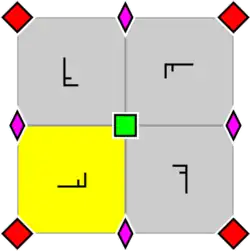 ![]() Arranjo dentro de uma célula primitiva de rotocentros de ordens 2 e 4. Um domínio fundamental é indicado em amarelo. |