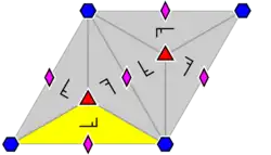 ![]() Arranjo dentro de uma célula primitiva de rotocentros de ordens 2, 3 e 6, isoladamente ou em combinação (considere o símbolo de ordem 6 como uma combinação de um símbolo de ordens 2 e 3); no caso de simetria de ordem 2, a forma do paralelogramo pode ser diferente. Para o caso p6, um domínio fundamental é indicado em amarelo. |