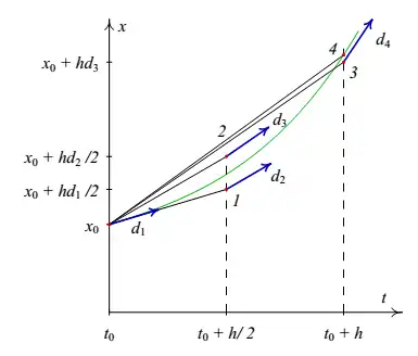 No método de Runge-Kutta de quarta ordem, o valor da derivada, obtém-se a partir da média das derivadas em 4 pontos diferentes, com pesos diferentes (figura ao lado).[2]