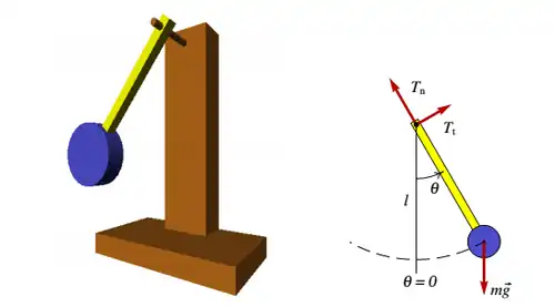 Sobre o pêndulo atuam duas forças externas: o peso, vertical, e uma força de contato do eixo sobre a barra, que por conveniência será decomposta numa componente tangencial e outra componente normal na direção da barra.[2]