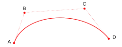 Um spline é uma curva definida matematicamente por dois ou mais pontos de controle.[1] Os pontos de controle que ficam na curva são chamados de nós.[1] Os demais pontos definem a tangente à curva em seus respectivos nós. Por exemplo, a curva de Bézier definida pelos pontos (A, B, C e D) é delimitada pelos nós A e D e nesses nós, a curva é tangente ao vetores AB e DC respectivamente. Variando as posições dos pontos B e C, a curva apenas varia sua inclinação, mas continua passando pelos pontos A e D.