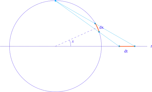 Outro ponto de vista geométrico: Desenhe o círculo unitário e seja o ponto . Uma reta através de (exceto a reta vertical) é determinada por sua inclinação. Além disso, cada uma das retas (exceto a reta vertical) cruza o círculo unitário em exatamente dois pontos, um dos quais é . Isso determina uma função dos pontos no círculo unitário às inclinações. As funções trigonométricas determinam uma função dos ângulos aos pontos no círculo unitário e, combinando essas duas funções, temos uma função dos ângulos às inclinações.