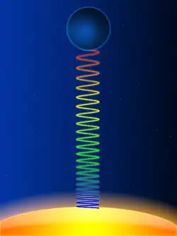 Desvio para o vermelho devido a um campo gravitacional. A frequência da onda eletromagnética (luz) emitida por estrelas massivas densas diminui à medida que esta afasta-se da estrela. Como a referência para medir-se o tempo é a onda eletromagnética, a gravidade afeta a medida do tempo. Um relógio na Terra está sempre atrasando em relação a um relógio absolutamente idêntico situado nas proximidades do Sol.