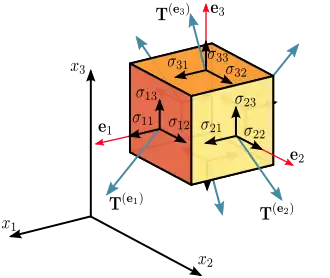 - Mecânico - Acima o tensor da Tensão (mecânica) está representada em apenas duas dimensões. Mais corretamente (figura 1) a tensão é modelada pelo tensor de Cauchy com nove componentes, três para cada dimensão. O tensor das tensões de Cauchy é usado para análise de tensões dos corpos materiais experimentando pequenas deformações.